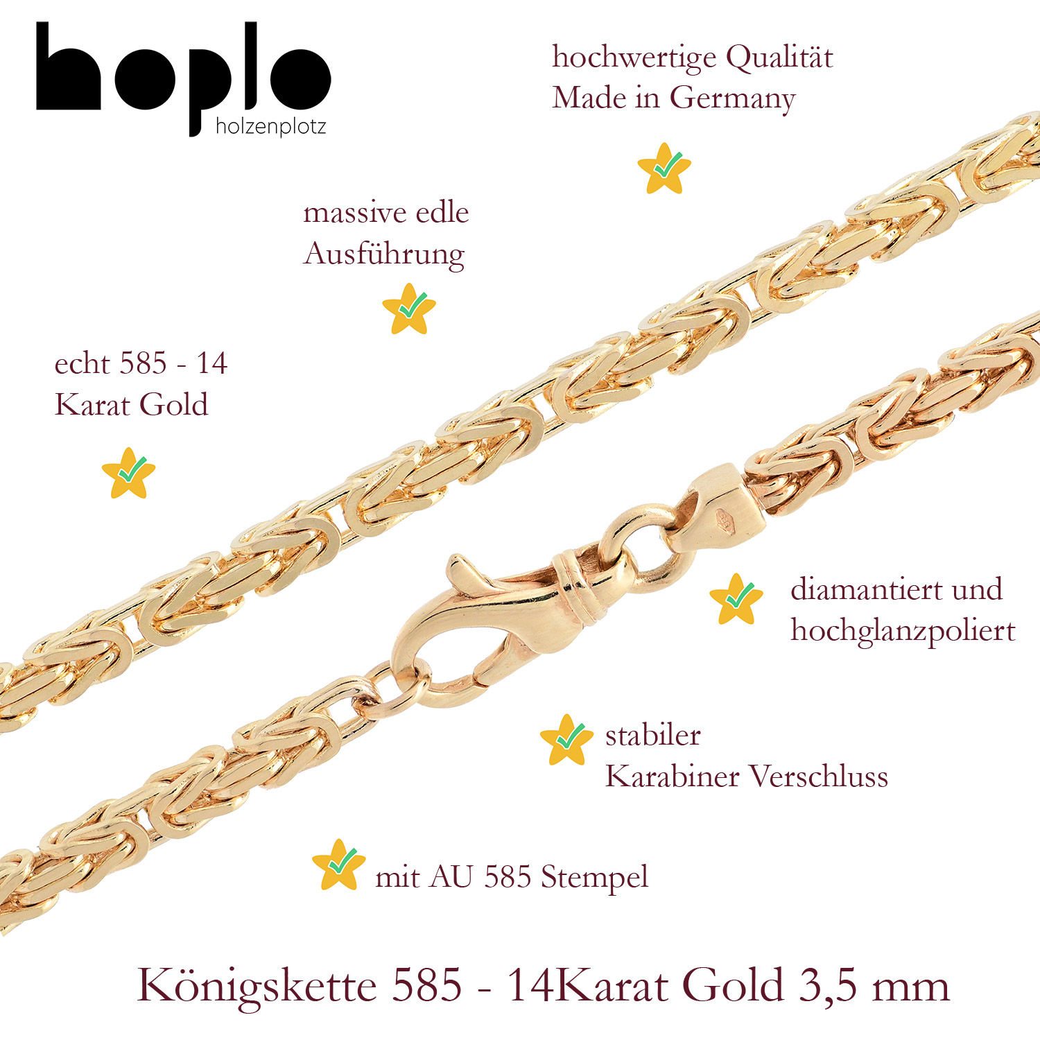 Unsere Ketten werden in Deutschland hergestellt. Bei diesen Ketten handelt es sich um eine solide, edle, massive und sehr hochwertige Ausführung mit einem Gold Feingehalt von 585 - 14 Karat Gold. Natürlich sind alle Ketten gestempelt. Diese Goldketten sind absolut präzise gearbeitet und sehr bequem zu tragen. Diese Ketten sind hochglanzpoliert für ein noch edleres Erscheinungsbild. Das Byzantinische Flechtmuster wird in Deutschland auch als Königskette bezeichnet. Die Königsketten auch Byzantinerketten genannt, werden von Männern und Frauen getragen. Die aufwändige und auffällige Flechtart dieser Kette ist Tausende von Jahren alt. Die meisten Männer bevorzugen Ketten aus klassischen Materialien wie Silber oder Gold. Die Breite der Kette und das Muster machen die Königskette beliebt bei Männern jeden Alters. Die dünneren Modelle wirken jedoch auch bei Frauen sehr stilvoll.