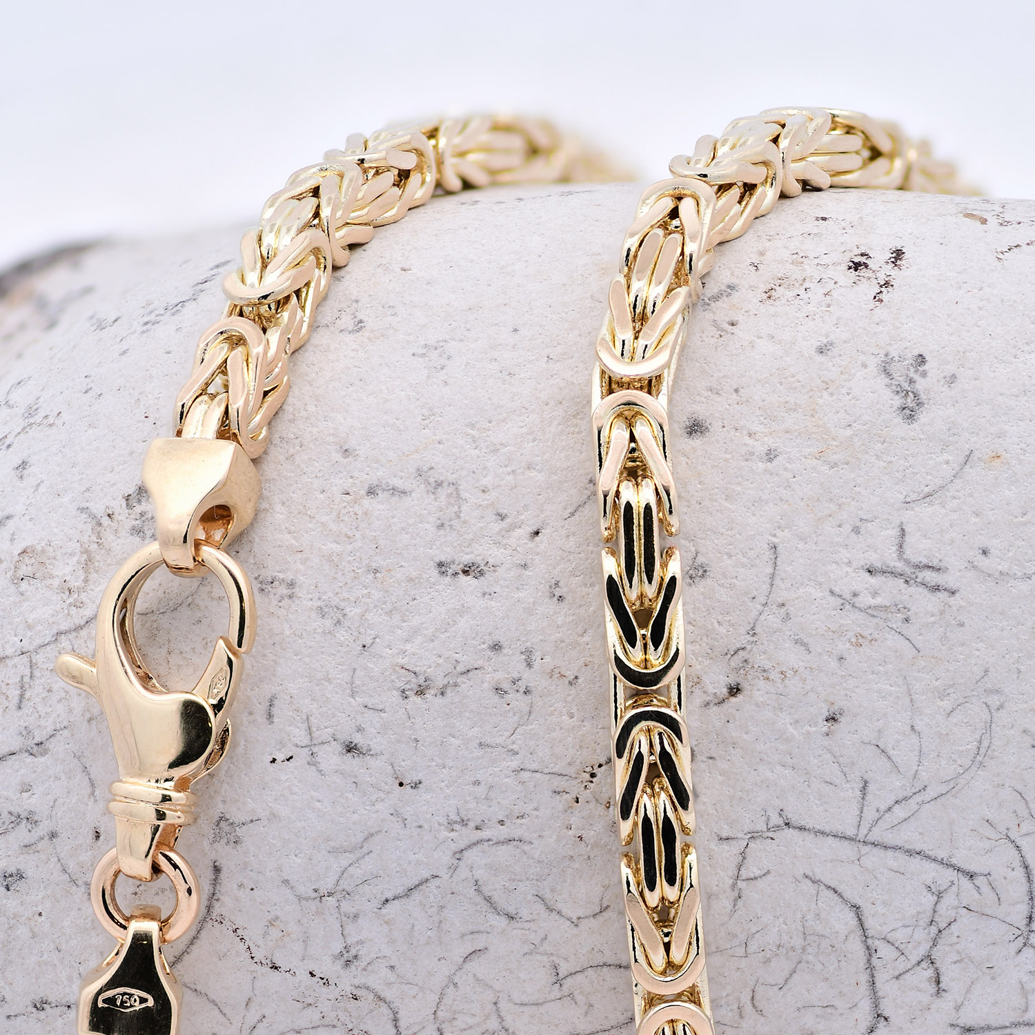 Unsere Ketten werden in Deutschland hergestellt. Bei diesen Ketten handelt es sich um eine solide, edle, massive und sehr hochwertige Ausführung mit einem Gold Feingehalt von 750 - 18 Karat Gold. Natürlich sind alle Ketten gestempelt. Diese Goldketten sind absolut präzise gearbeitet und sehr bequem zu tragen. Diese Ketten sind hochglanzpoliert für ein noch edleres Erscheinungsbild. Das Byzantinische Flechtmuster wird in Deutschland auch als Königskette bezeichnet. Die Königsketten auch Byzantinerketten genannt, werden von Männern und Frauen getragen. Die aufwändige und auffällige Flechtart dieser Kette ist Tausende von Jahren alt. Die meisten Männer bevorzugen Ketten aus klassischen Materialien wie Silber oder Gold. Die Breite der Kette und das Muster machen die Königskette beliebt bei Männern jeden Alters. Die dünneren Modelle wirken jedoch auch bei Frauen sehr stilvoll.