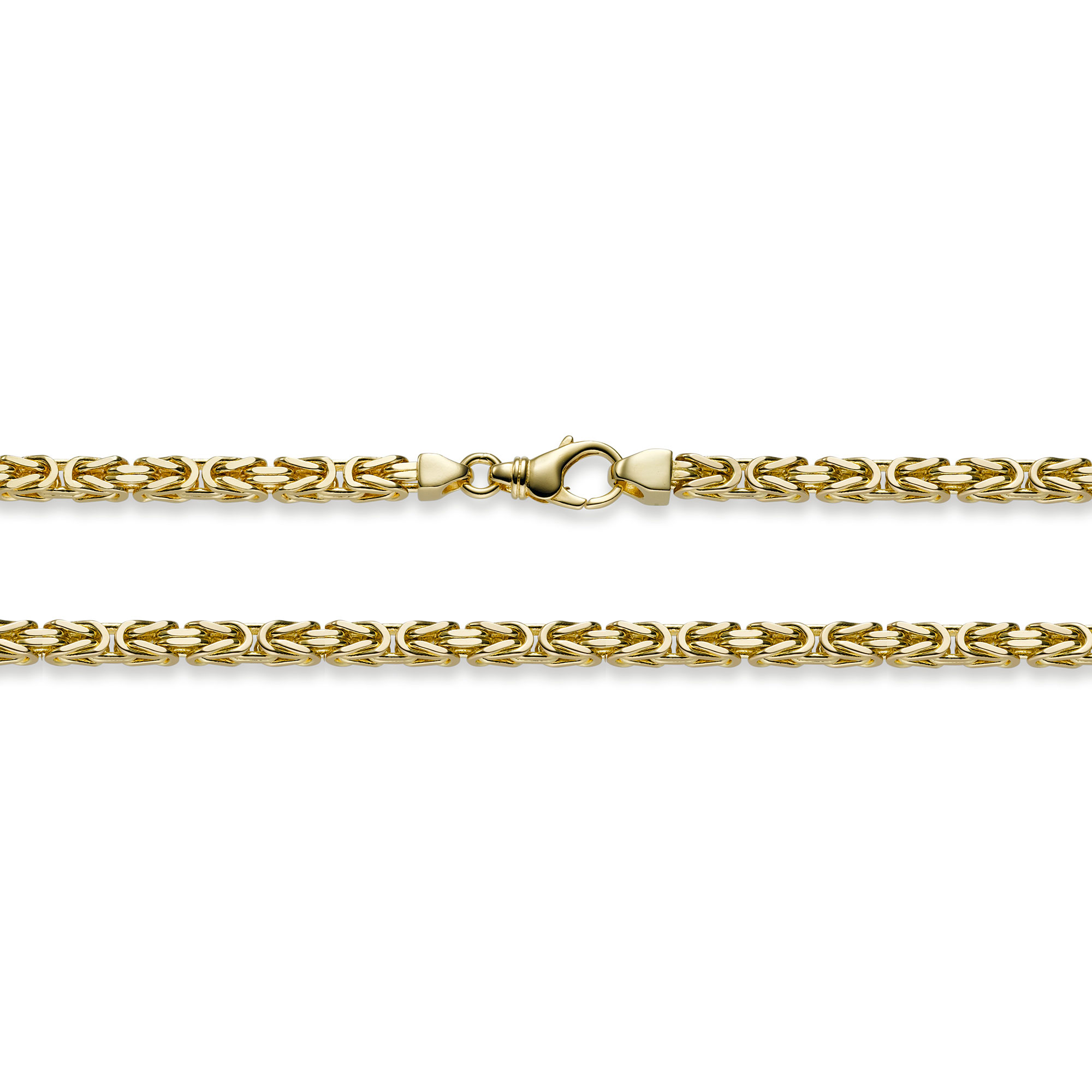 Unsere Ketten werden in Deutschland hergestellt. Bei diesen Ketten handelt es sich um eine solide, edle, massive und sehr hochwertige Ausführung mit einem Gold Feingehalt von 750 - 18 Karat Gold. Natürlich sind alle Ketten gestempelt. Diese Goldketten sind absolut präzise gearbeitet und sehr bequem zu tragen. Diese Ketten sind hochglanzpoliert für ein noch edleres Erscheinungsbild. Das Byzantinische Flechtmuster wird in Deutschland auch als Königskette bezeichnet. Die Königsketten auch Byzantinerketten genannt, werden von Männern und Frauen getragen. Die aufwändige und auffällige Flechtart dieser Kette ist Tausende von Jahren alt. Die meisten Männer bevorzugen Ketten aus klassischen Materialien wie Silber oder Gold. Die Breite der Kette und das Muster machen die Königskette beliebt bei Männern jeden Alters. Die dünneren Modelle wirken jedoch auch bei Frauen sehr stilvoll.