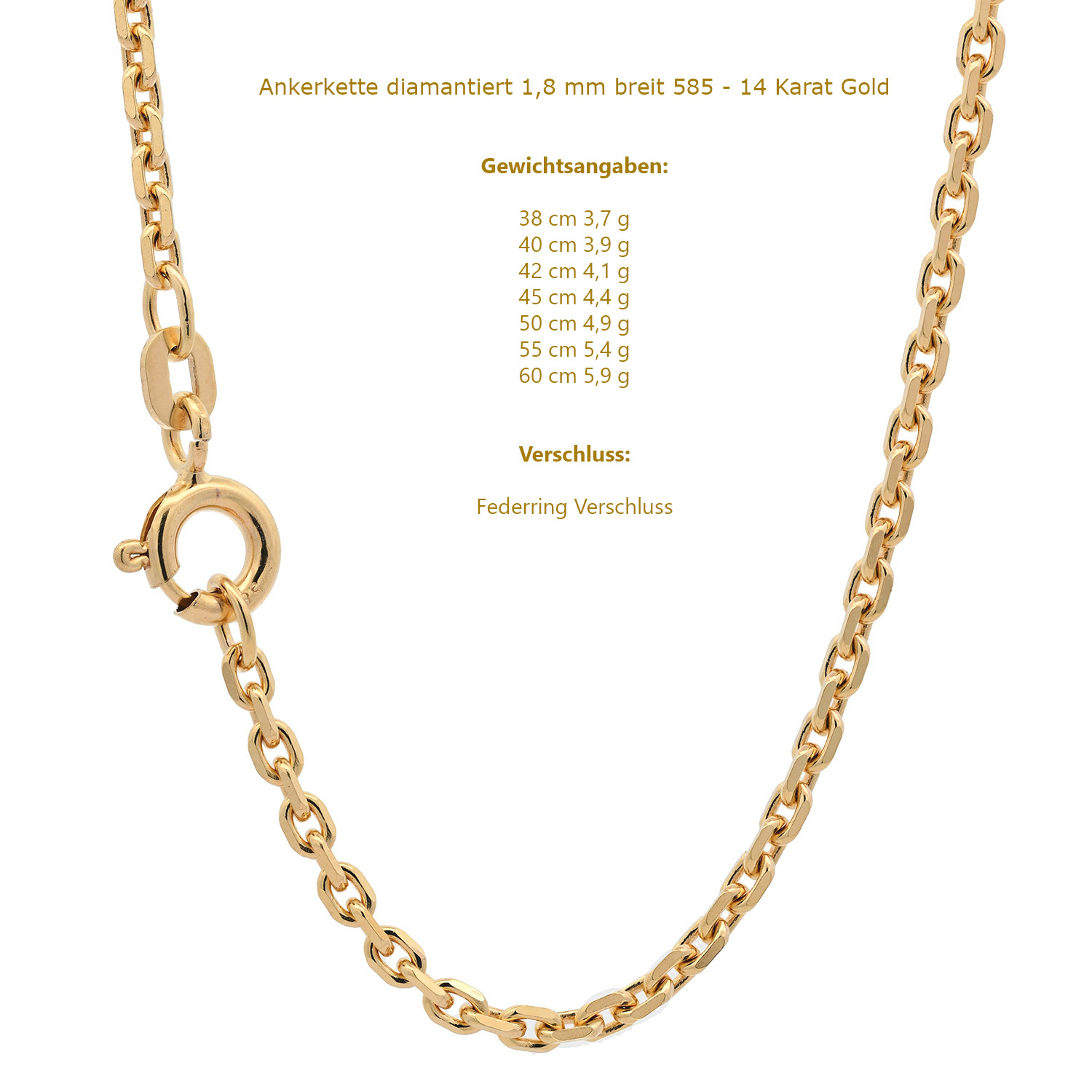 Edle massive Goldkette Ankerkette diamantiert 1,8 mm Halskette aus 585 - 14 Karat Gelbgold von höchster Qualität – Made in Germany - Länge nach Wahl