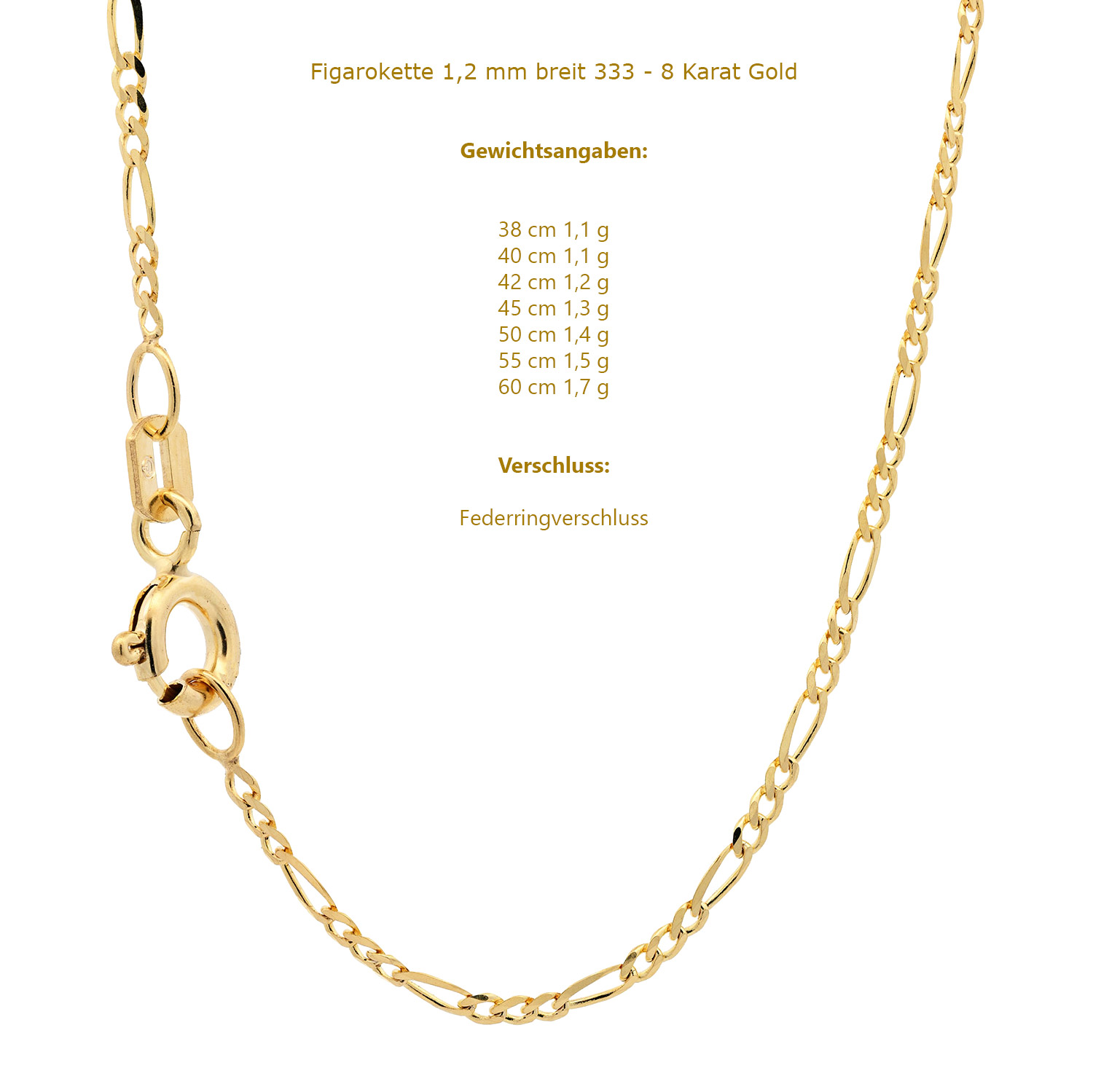 Edle massive Goldkette Figarokette diamantiert aus 333 - 8 Karat Gold - Kettenbreite 1,2 mm - Gelbgold von höchster Qualität – Made in Germany.