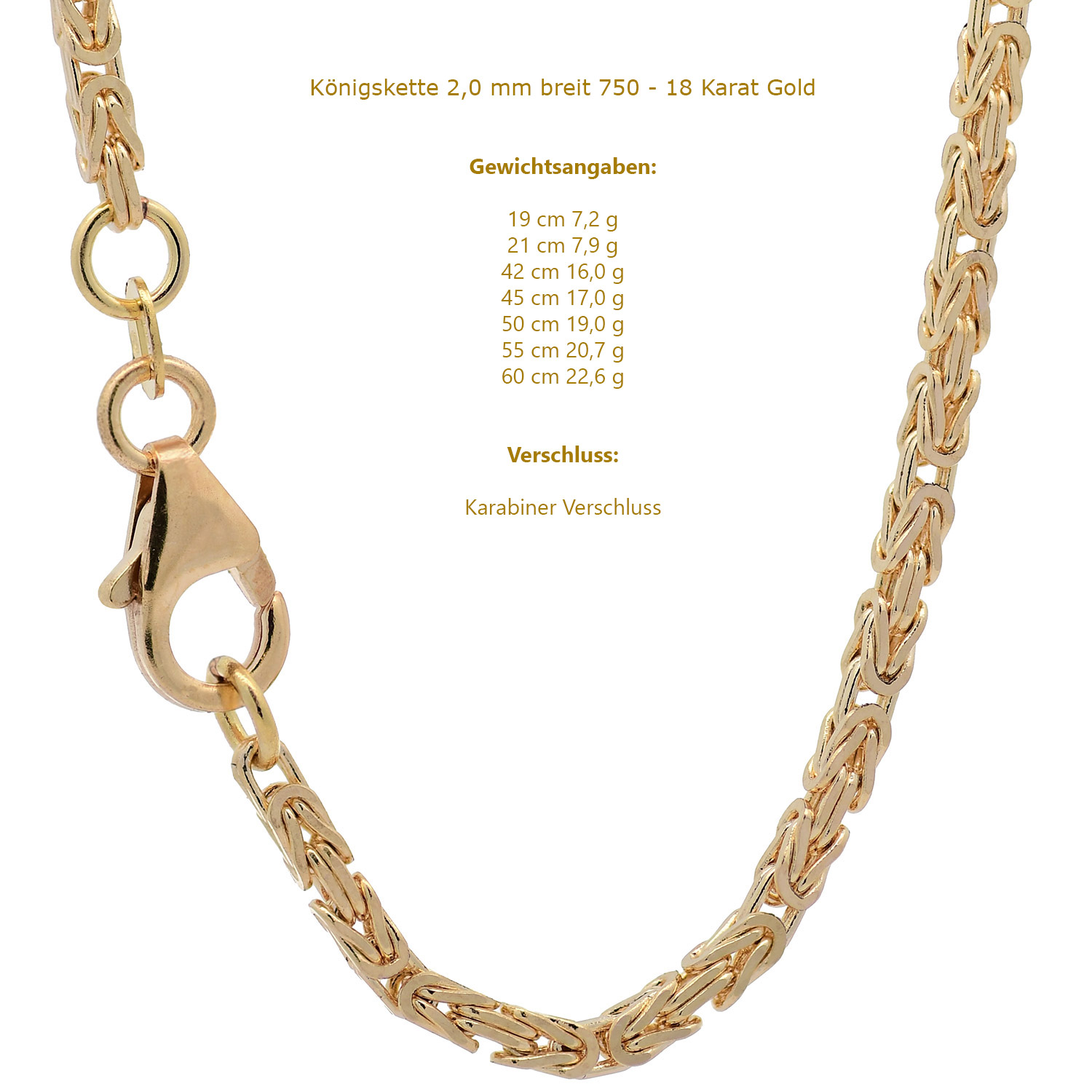 Edle massive Goldkette Königskette 2,0 mm Halskette oder Armkette aus 750 - 18 Karat Gelbgold von höchster Qualität – Made in Germany - Länge nach Wahl