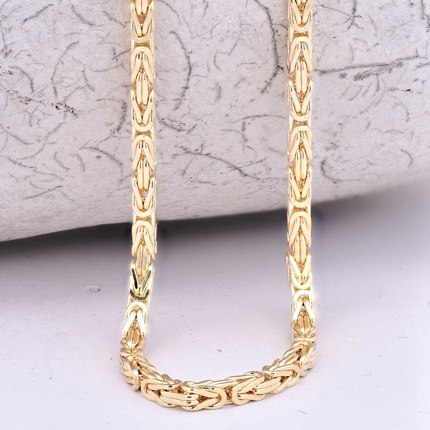 Das Byzantinische Flechtmuster wird in Deutschland auch als Königskette bezeichnet. Die Königsketten auch Byzantinerketten genannt, werden von Männern und Frauen getragen. Die aufwändige und auffällige Flechtart dieser Kette ist Tausende von Jahren alt. Die meisten Männer bevorzugen Ketten aus klassischen Materialien wie Silber oder Gold. Die Breite der Kette und das Muster machen die Königskette beliebt bei Männern jeden Alters. Die dünneren Modelle wirken jedoch auch bei Frauen sehr stilvoll.