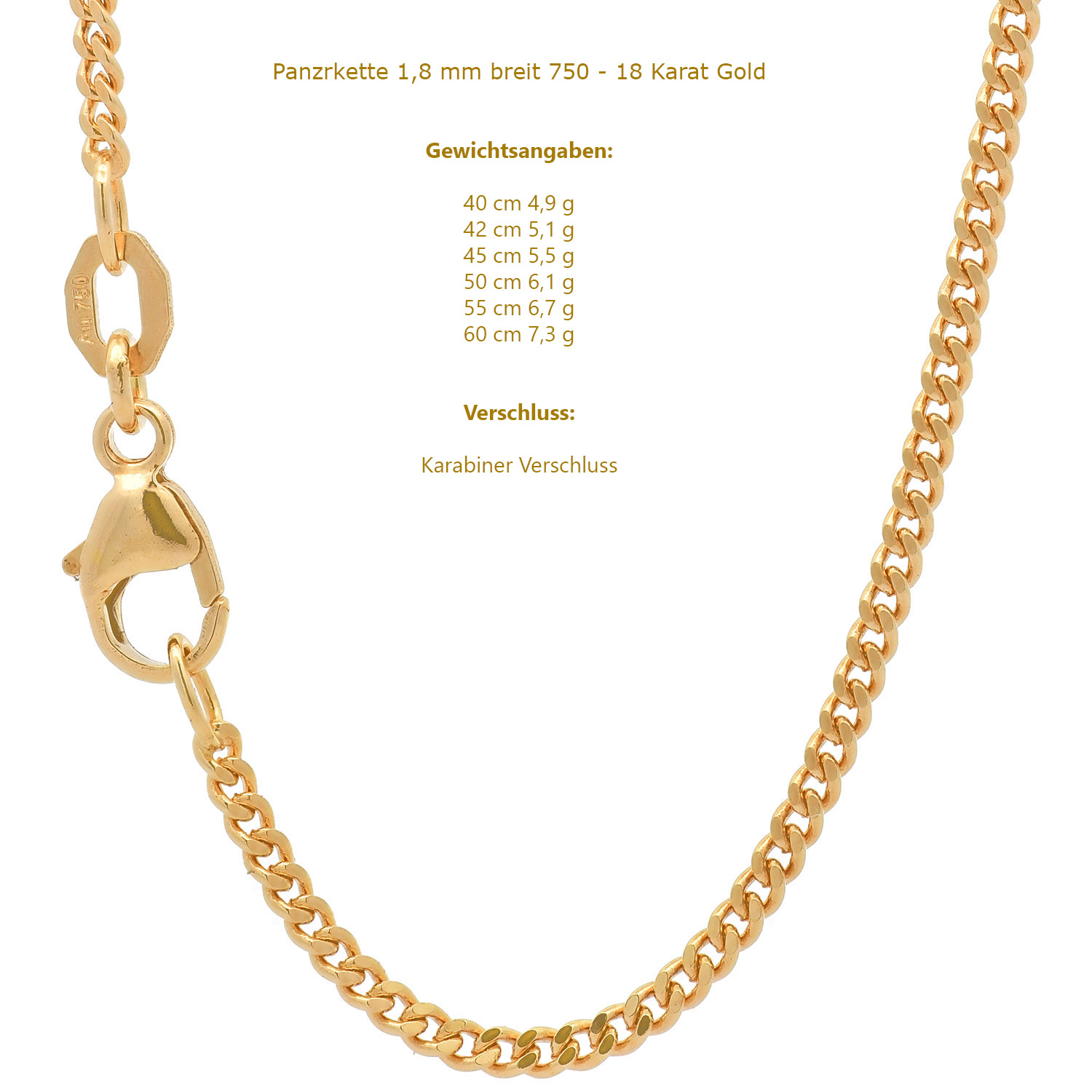 Wir scheuen uns nicht, das jeweilige ca. Gewicht in g anzugeben. Warum manche Anbieter darauf verzichten? Da Gold ein wertvolles Material ist, hängt der Herstellerpreis erheblich von der Materialstärke und vom Gewicht ab. Wenn eine Kette bei gleichen Außenmaßen leichter ist, wurde am Material gespart. Dies kann Auswirkung auf die Haltbarkeit haben. Unsere Gewichtsangaben können herstellungsbedingt + - 5% schwanken.