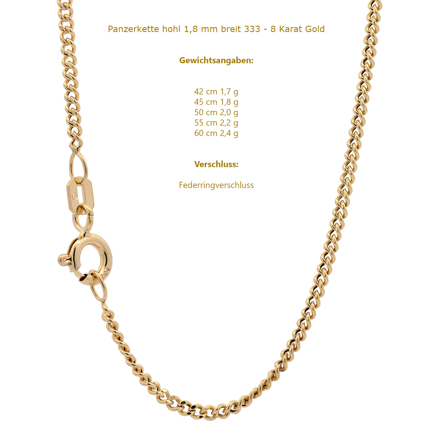 Edle massive Goldkette Panzerkette hohl aus 333 - 8 Karat Gold - 1,8 mm breit - Gelbgold von höchster Qualität – Made in Germany.