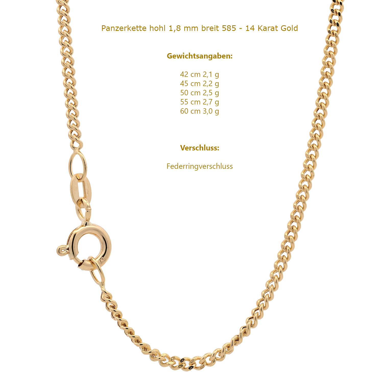 Edle massive Goldkette Panzerkette hohl aus 585 - 14 Karat Gold - 1,8 mm breit - Gelbgold von höchster Qualität – Made in Germany.