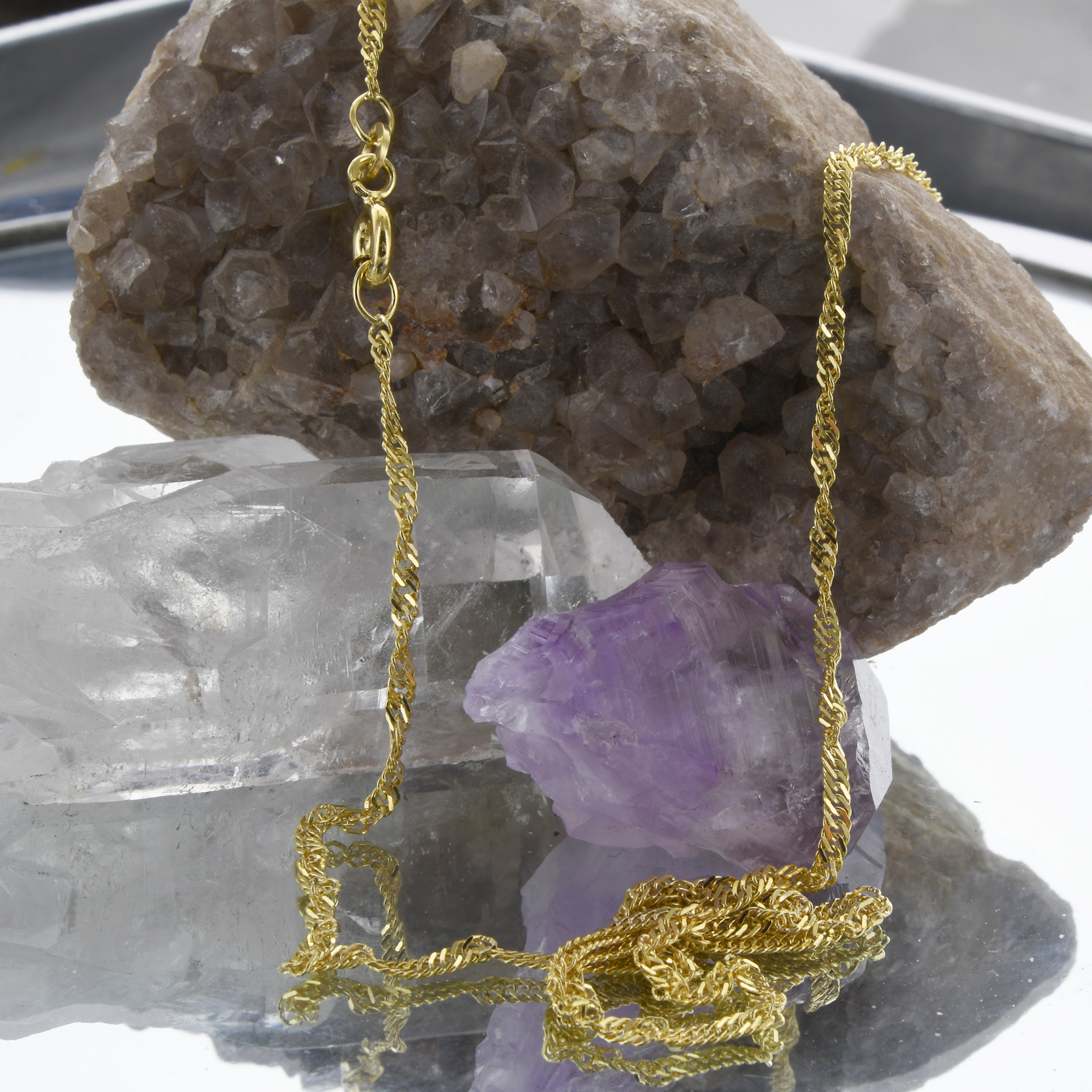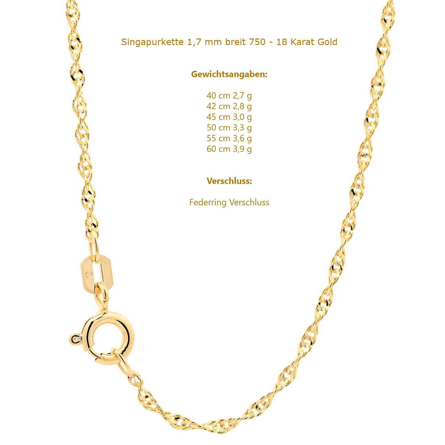 Bei unseren Ketten handelt es sich um eine solide, edle, massive und sehr hochwertige Ausführung in Juwelierqualität. Natürlich ist die Kette gestempelt. Die Singapurkette ist absolut präzise gearbeitet und sehr bequem zu tragen. Sie ist diamantiert, wobei die Kette mittels rotierender Diamanten geschliffen wird und dadurch einen noch edleren Glanz erhält und danach hochglanzpoliert für ein noch edleres Erscheinungsbild.