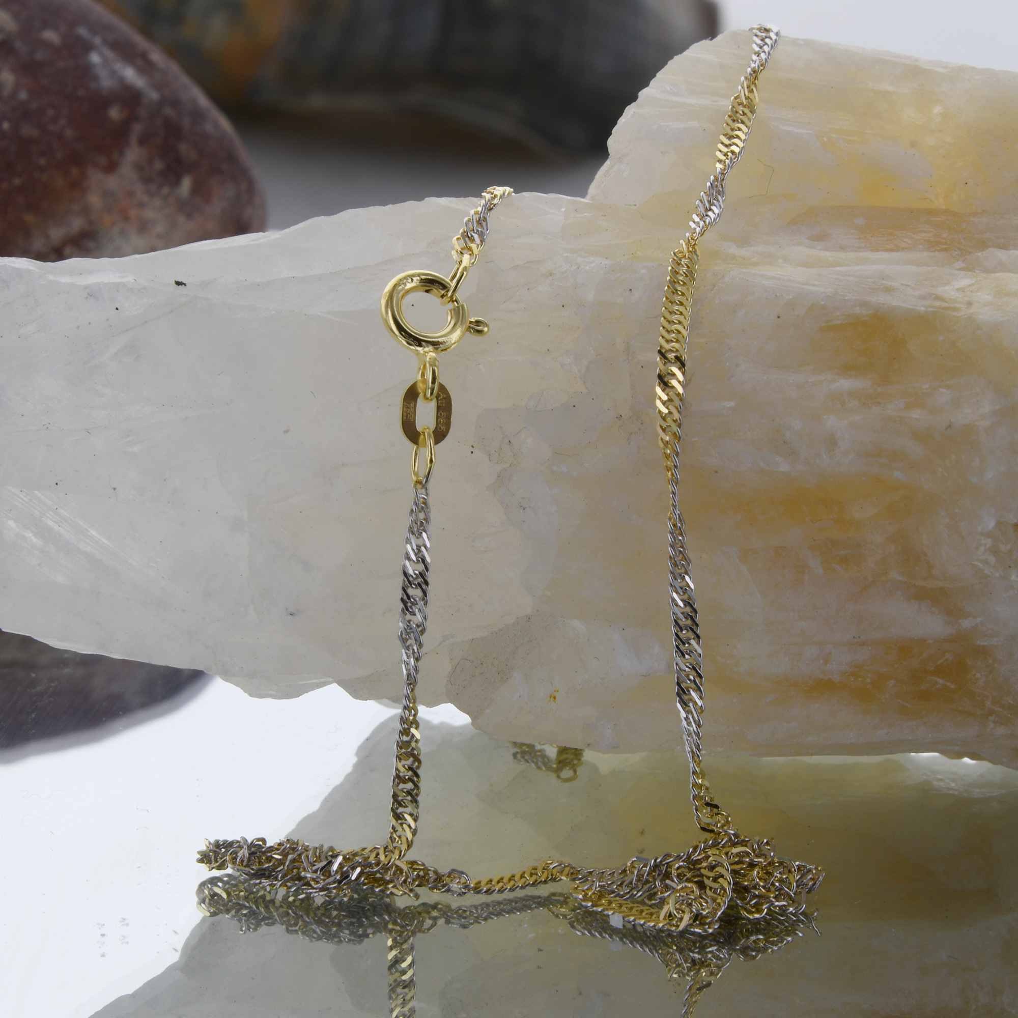 Bei unseren Ketten handelt es sich um eine solide, edle, massive und sehr hochwertige Ausführung in Juwelierqualität. Natürlich ist die Kette gestempelt. Die Singapurkette ist absolut präzise gearbeitet und sehr bequem zu tragen. Sie ist diamantiert, wobei die Kette mittels rotierender Diamanten geschliffen wird und dadurch einen noch edleren Glanz erhält und danach hochglanzpoliert für ein noch edleres Erscheinungsbild.