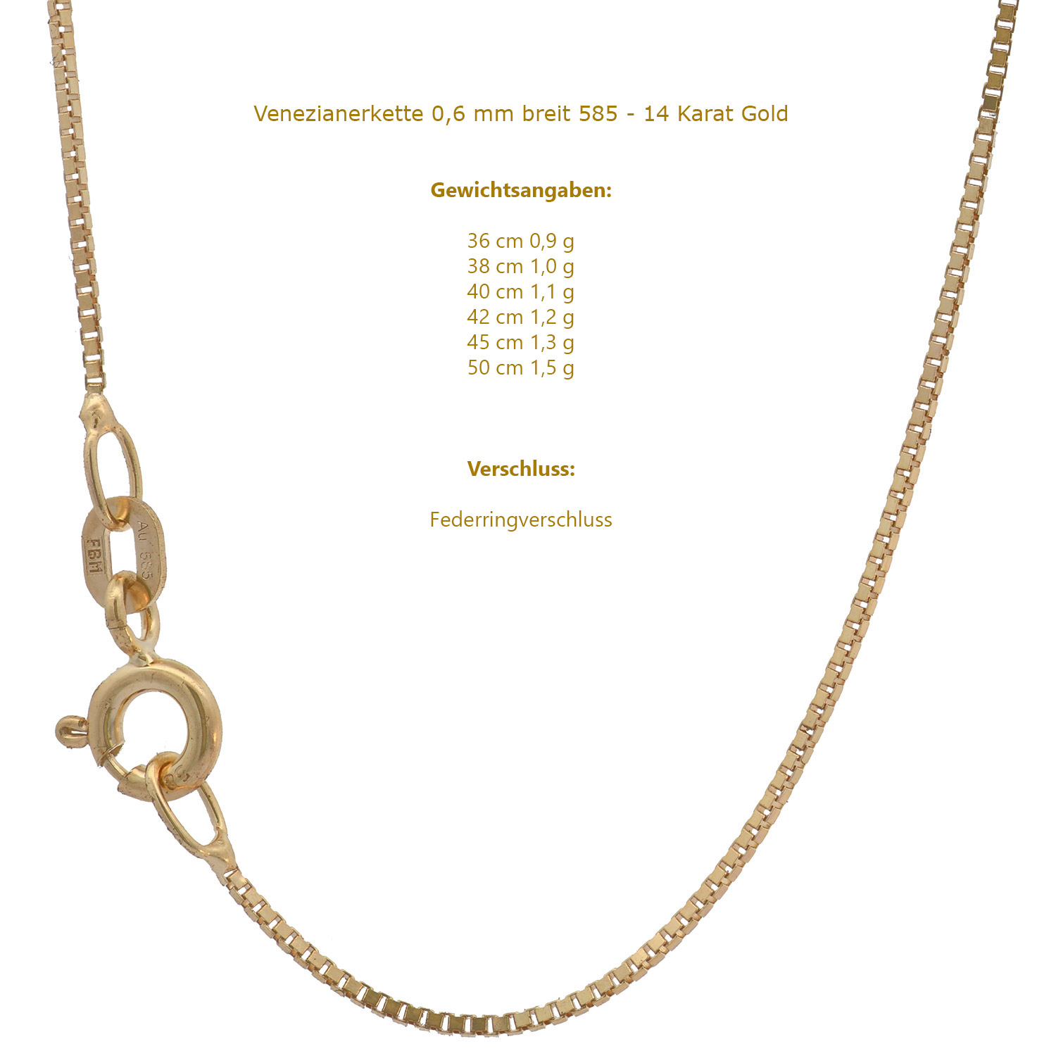 Edle massive Goldketten Venezianerkette Halskette Breite 0,6 mm aus 585 - 14 Karat Gelbgold von höchster Qualität – Made in Germany