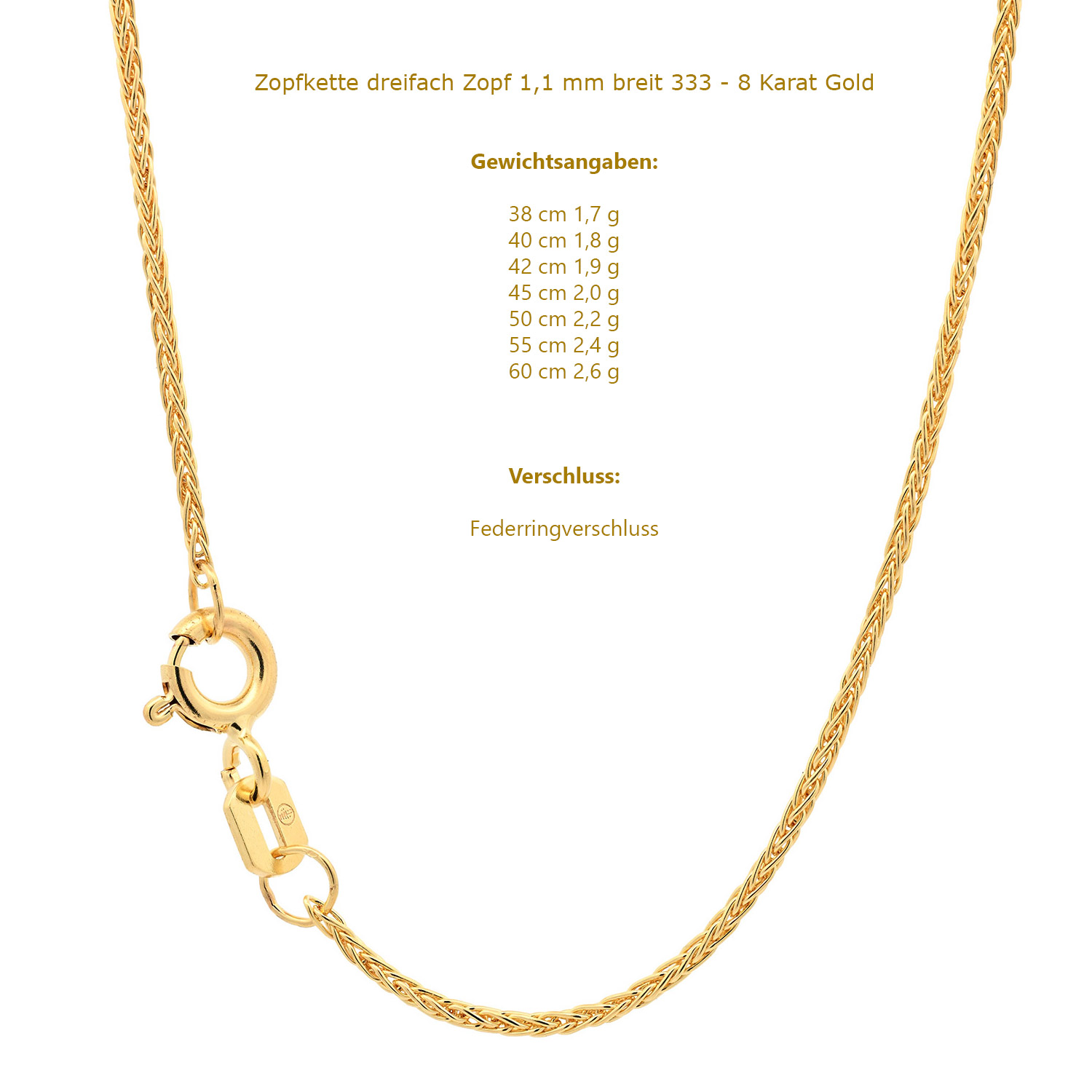Edle massive Goldkette Zopfkette aus 333 - 8 Karat Gold - Kettenbreite 1,1 mm - Gelbgold von höchster Qualität – Made in Germany.