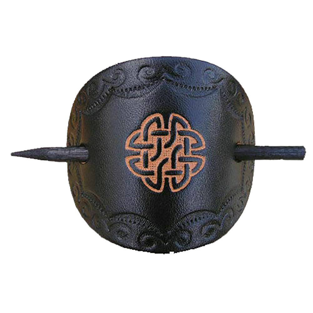 Handgemachte Lederhaarspange mit Holzstab. Farbe: schwarz Diese Lederhaarspange wird in der Mitte von einem zierlichen keltischen Knotenmuster verziert. Sie eignet sich sowohl für den Alltag als auch als Schmuck für mittelalterliche Feste und Events.