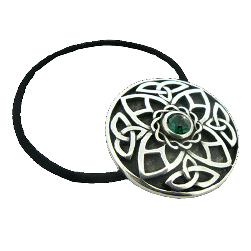 Haargummi mit rundem keltischen Motiv aus hochwertigem Zinn und mit einem farbigen (blau, türkis oder weiß) Schmuckstein verziert. Stabiler schwarzer Haargummi (dicke Qualität) Die Farben der Schmucksteine sind zufällig gepackt und können nicht individuell bestellt werden.