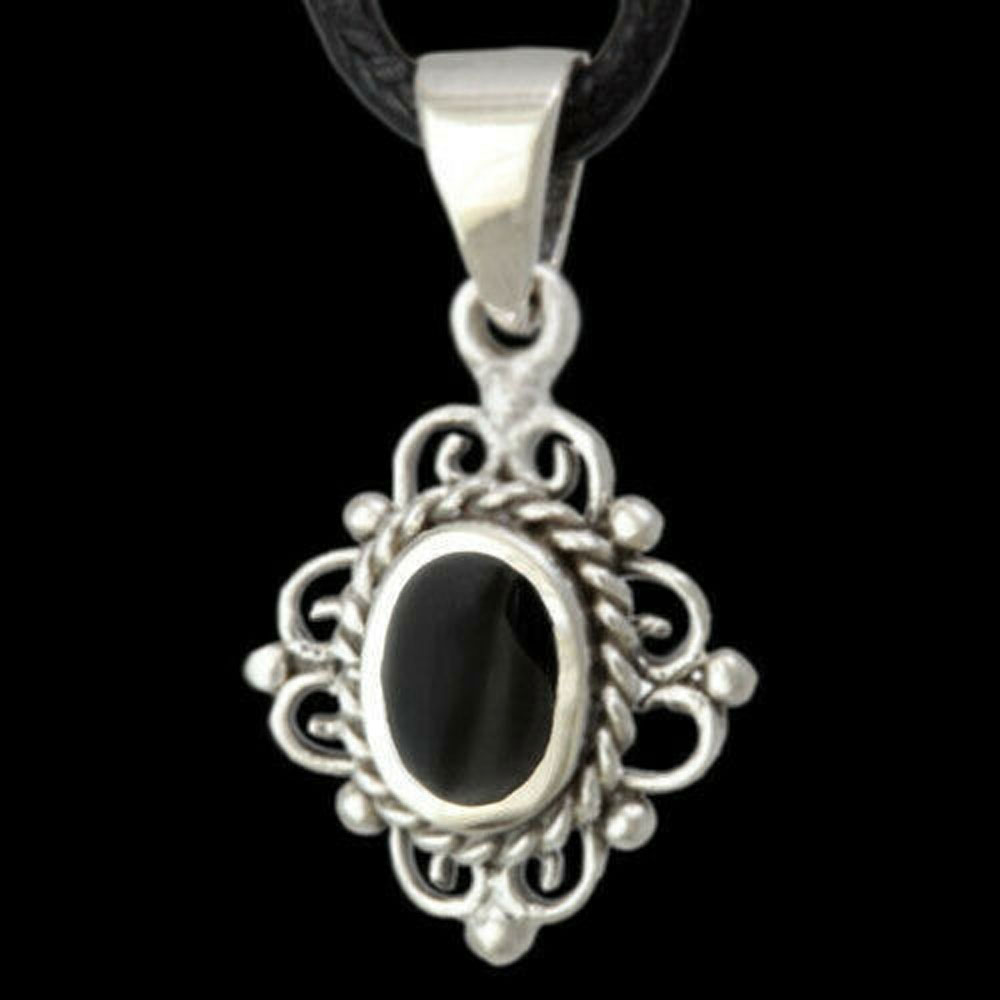Dieses feine Amulett mit seinen filigranen Mustern verzaubert Dich und versetzt Dich in andere Welten. Der schwarze Onyxstein hilft Dir zu inneren Harmonie und Frieden.