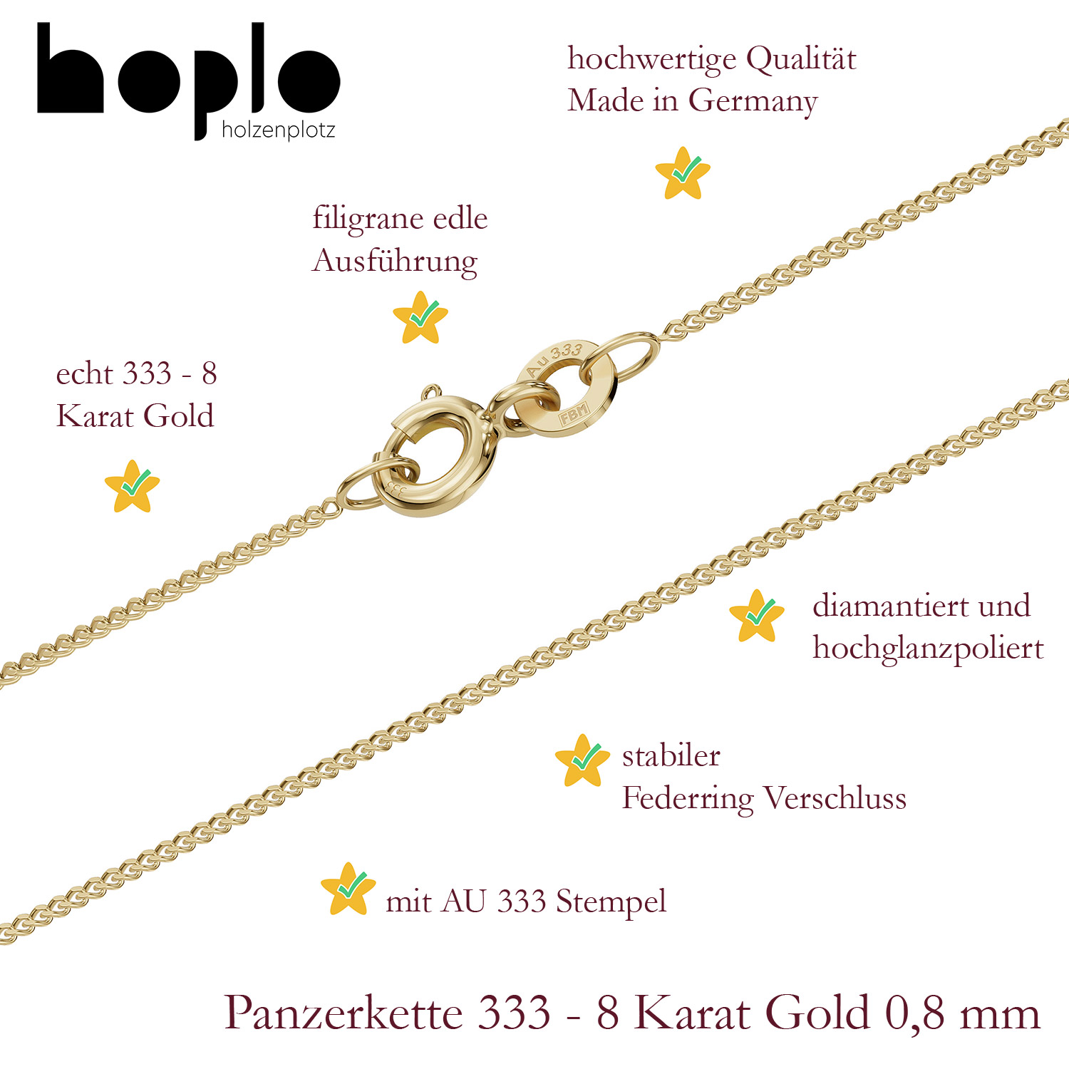 Unsere Ketten werden in Deutschland hergestellt. Bei diesen Ketten handelt es sich um eine solide, edle, massive und sehr hochwertige Ausführung mit einem Gold Feingehalt von 333- 8 Karat Gold. Natürlich sind alle Ketten gestempelt. Diese Goldketten sind absolut präzise gearbeitet und sehr bequem zu tragen. Die Gold Ketten sind diamantiert. Dabei wird die Kette mittels rotierender Diamanten geschliffen und erhält dadurch einen noch edleren Glanz. Diese Ketten sind hochglanzpoliert für ein noch edleres Erscheinungsbild. Bitte bestellen Sie diese Kette nur, wenn Sie wirklich eine sehr feine, dünne Kette haben möchten. Diese Kette ist mit ihren 0,8 mm sehr zart und filigran.