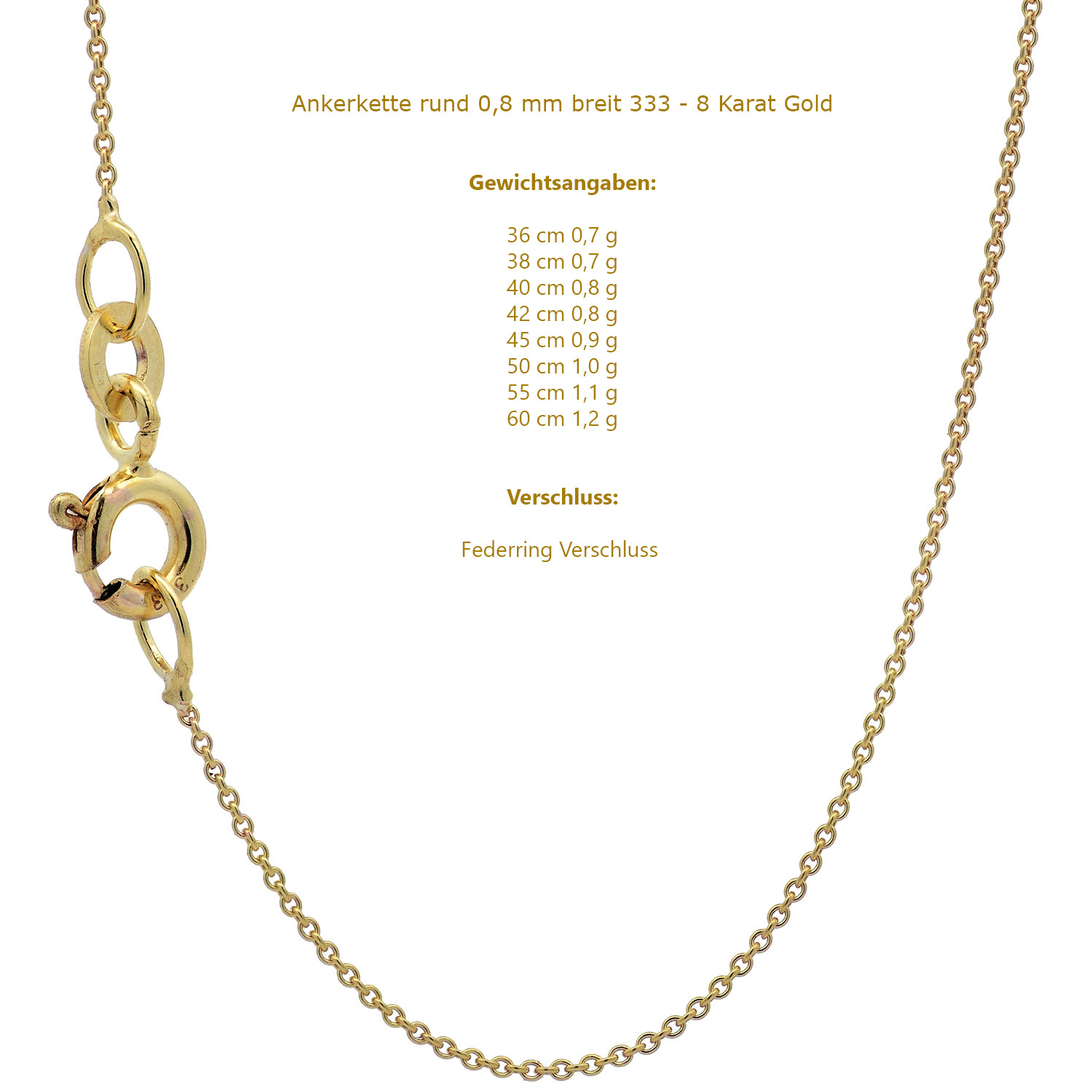 Edle feine dünne filigrane Goldkette Ankerkette rund aus massiv 333 - 8 Karat Gold - 0,8 mm breit - Gelbgold von höchster Qualität Made in Germany.