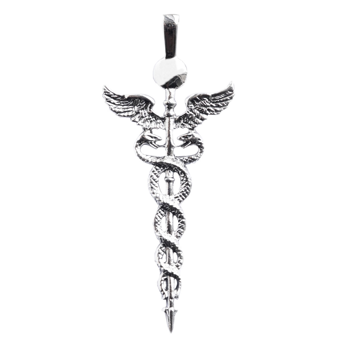 Dieser große Caduceus Anhänger wird der Hermesstab genannt. Die beiden Schlangen symbolisieren eine unsichtbare Kraft entlang der Wirbelsäule unseres Körpers. Zusammen mit dem (geflügelten Geist) erscheint die Sonne (auch die eigene Sonne) - dargestellt im oberen Teil dieses Sterlingsilber Anhängers.