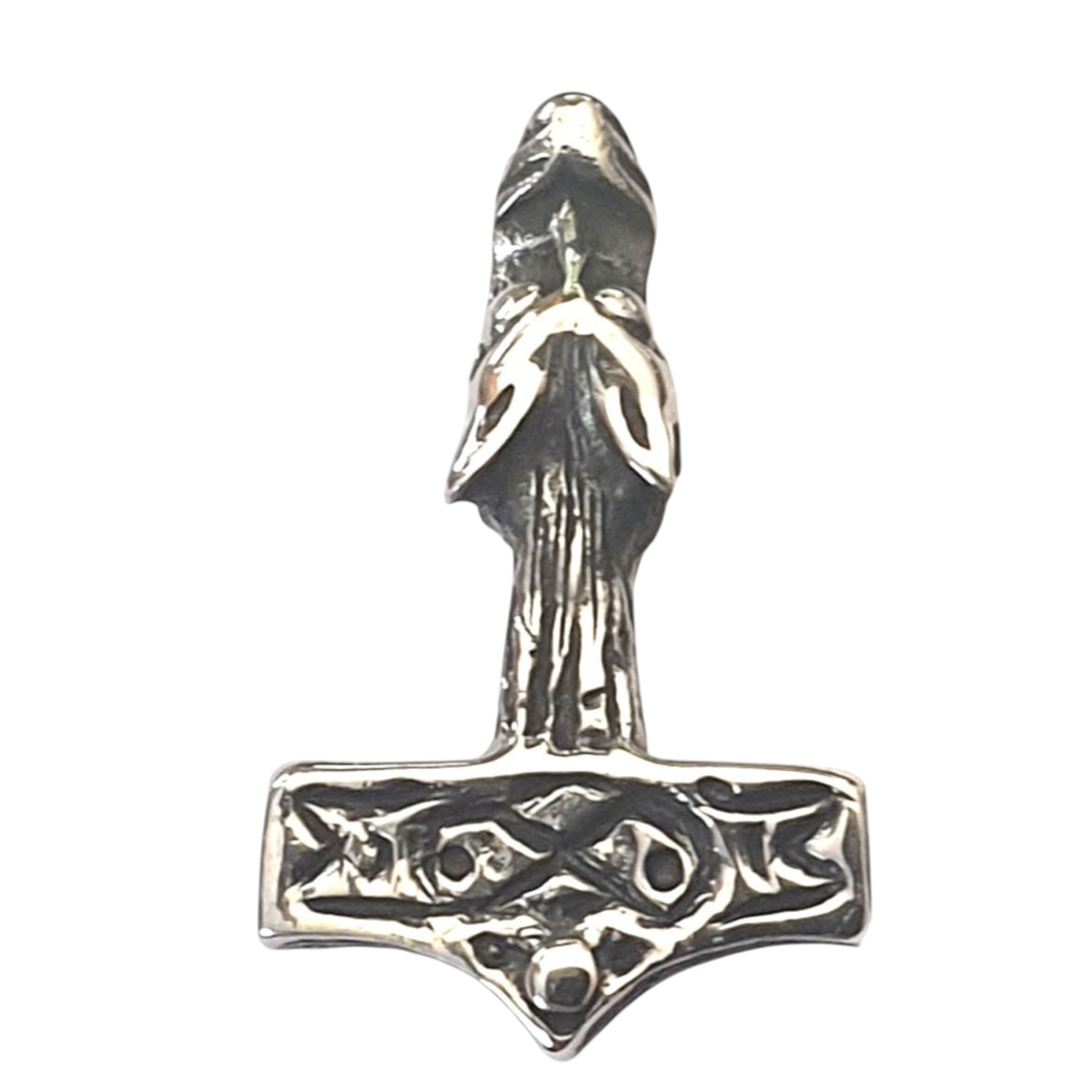 Diese Silberamulette stellen den Hammer des Thor dar, des Sohnes des Göttervaters Odin. Es wurde geschmiedet vom Zwerg Sindri, der dem Hammer einen zu kurzen Stil gab. Trotz dieses Makels besitzt diese Waffe Thors die wunderbare Kraft, wie ein Bumerang in die Hand dessen zurückzukehren, der sie geschleudert hat. Der Thorshammer ist das Zeichen, das am häufigsten auf Steinen und Runenschriften zu finden ist und in Felszeichnungen und hauptsächlich auf Grabmälern, welches die Ruhe des Verstorbenen sichern soll. Thor galt auch als Gott der Fruchtbarkeit, denn er regiert den Regen und die Winde, von denen die guten Ernten abhängen. Man sagte von ihm, er halte die schädlichen. Dämonen und die Ungeheuer in Schach. Mehr als jeder andere wacht er über die Unternehmungen der Riesen und aller Geister, die das Leben der Götter und die menschlichen Gemeinschaften bedrohen.
