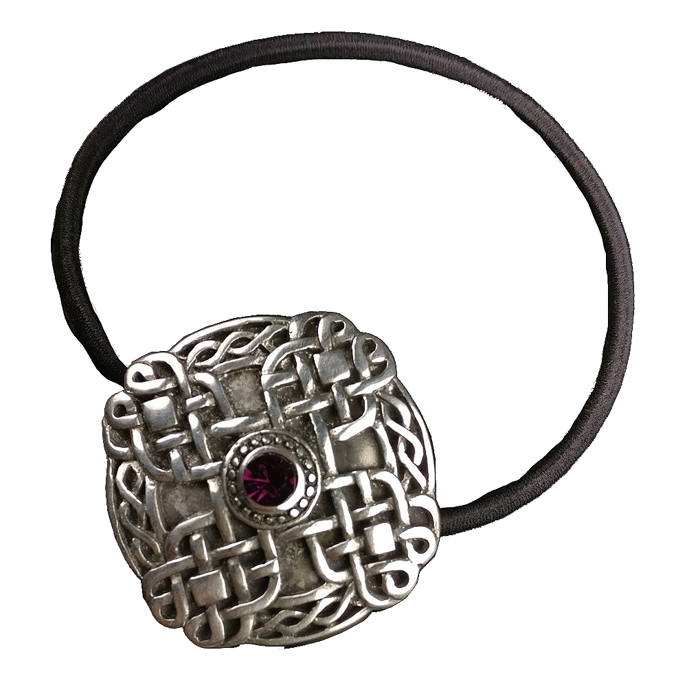Haargummi mit rundem keltischen Motiv aus hochwertigem Zinn und mit einem lila-pinken Schmuckstein verziert. Stabiler schwarzer Haargummi (dicke Qualität)