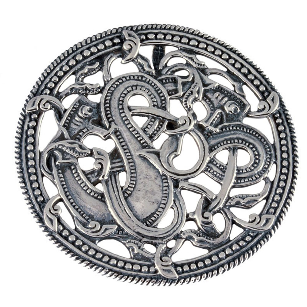 Wikingeranhänger im Jellingstil, das Motiv wurde angeregt durch den berühmten Runenstein von Jelling/Dänemark. Dieser wurde von Harald Blauzahn errichtet und enthält auf einer Seite die auf dem Schmuckstück dargestellten, verschlungenen Tiermotive. Sehr massiv und ca.5,3 cm Durchmesser.